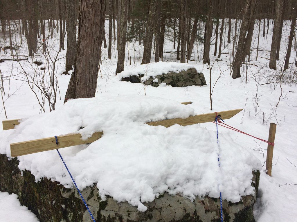 Sullivan county was hit by tornado-like winds of 95 mph on Tuesday, May 15th, 2018, resulting from a Downburst.  The painting was torn free from the travois-assembly but found face-up near twin-rocks.  It was reassembled and retied in the rain on Saturday, May 19th.